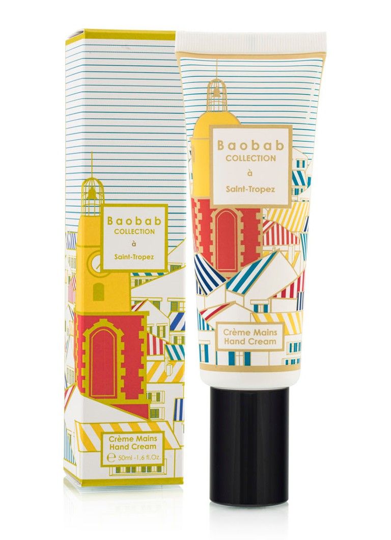 De Baobab Collection handcrème is verpakt in een tube van 50 ml met een gestileerde decoratie geïnspireerd op het mythische dorp Saint Tropez. De crème is zacht, hydraterend en licht en laat geen plakkerig gevoel achter op de handen. De aromatische geur laat een zachte aanwezigheid achter op de handen, in een gevoel van frisheid, hydratatie en comfort.
